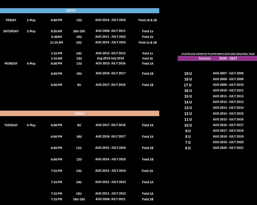 Tryouts for the 2026/2027 season are now open. There is no charge to register and participate in tryouts. All current and potential players must register and participate in tryouts to be considered for a team.