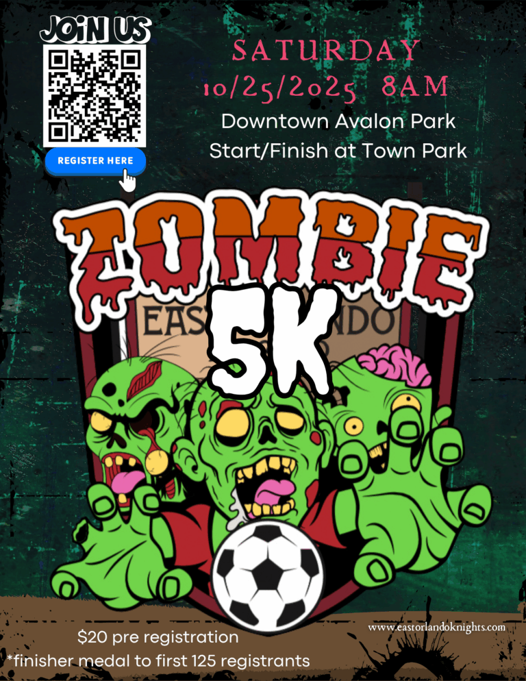 The East Orlando Knight FC invites everyone to come join us in costume for a fun 5k throughout downtown Avalon. This race will allow our non-profit soccer club to expand opportunities for the children of our community while improving community facilities for these young soccer players.
